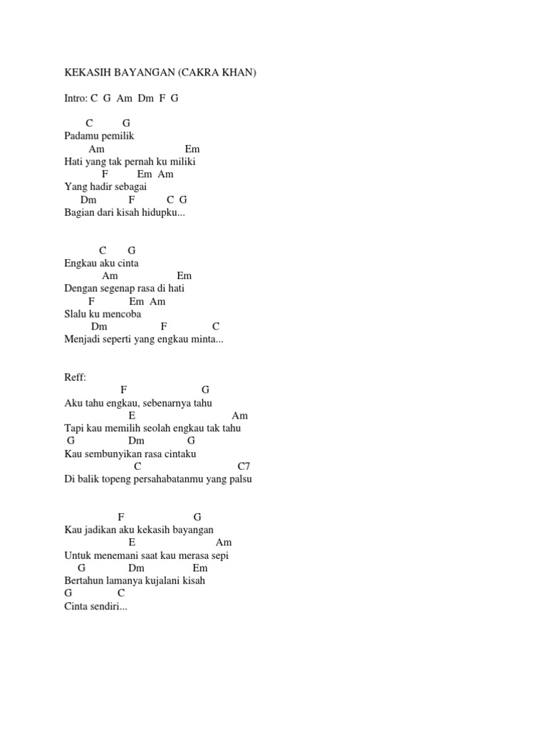intro c g/b a# a dm g / verse 1 c g am em padamu pemilik hati yang tak pernah ku miliki f em am dm f c g yang hadir sebagai bagian dari kisah hidupku c g am em engkau aku cinta dengan. Kekasih bayangan chords by cakra khan. Tonton video klip kekasih bayangan oleh cakra khan di sini. 0%0% found this document useful, mark this. See more of kekasih bayangan kekasih bayangan on facebook.